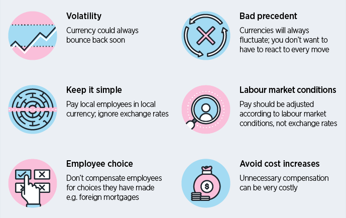 For several reasons, changing compensation packages as a direct response to currency movements is nearly always a bad idea.